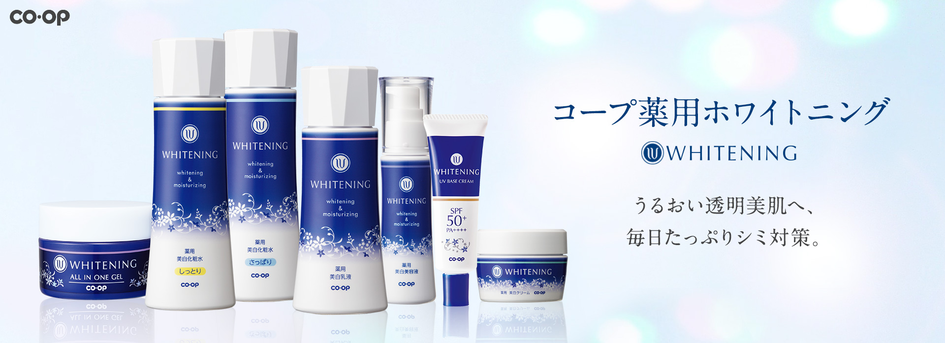 シミの元に先回り!悩みのない透明美白※肌へ。CO・OP薬用ホワイトニングシリーズは予防美白※の観点で 美白※肌を育成するスキンケアシリーズです。ビタミンC誘導体(L-アスコルビン酸 2-グルコシド)がシミの原因「メラニン」の生成を防ぎ、しっかりケア。和漢植物エキスがなめらかにお肌をうるおしながら、肌本来の透明感を引き出します。使うほど素肌のキレイを向上させます。前を向いて新しい自分に会えますように。